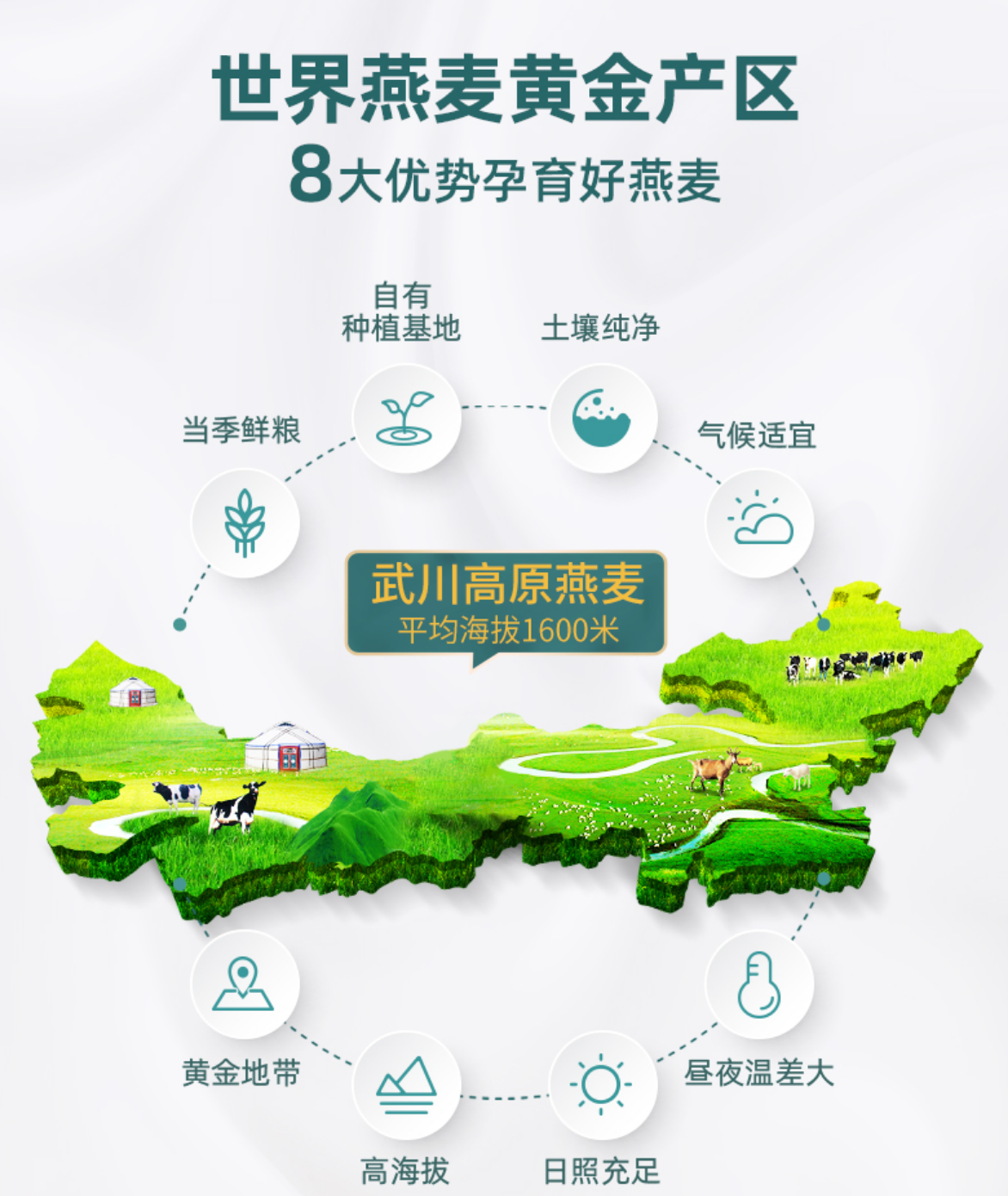 內(nèi)蒙古武川縣平均海拔1600米左右,屬高寒地帶,年平均氣溫2.4℃,干旱少雨,日照充足。是高原燕麥的黃金產(chǎn)區(qū),武川縣有“燕麥之都”的美譽。
