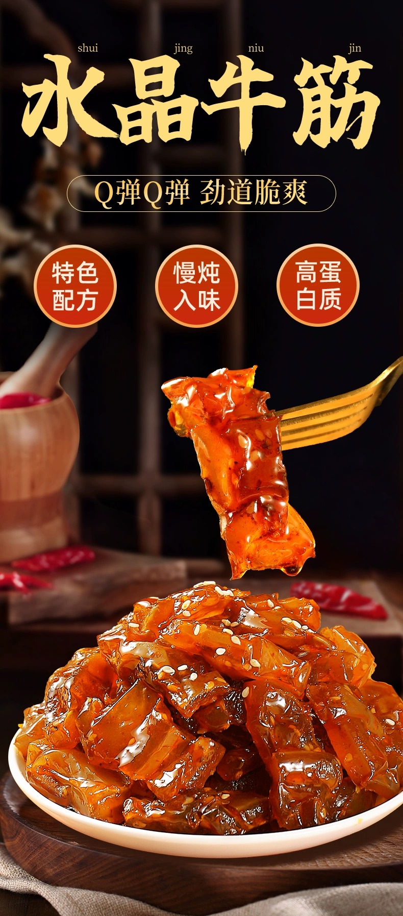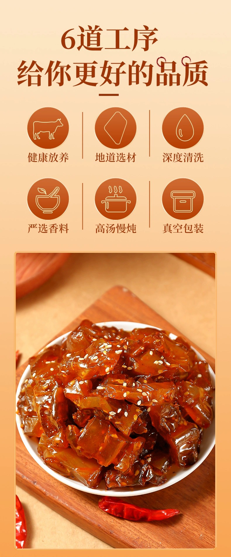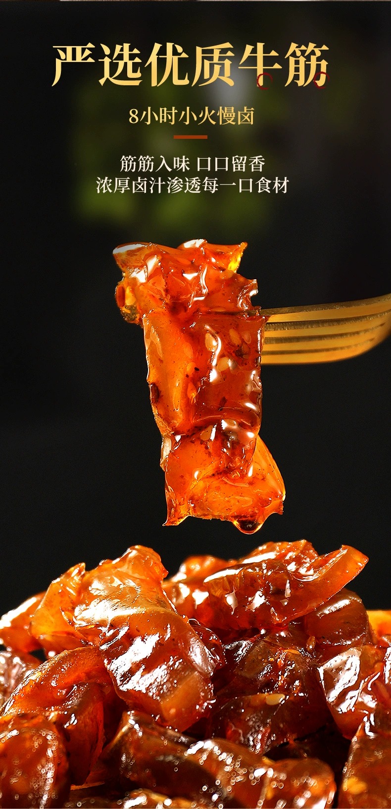 牛筋富含豐富的膠原蛋白,是美容養(yǎng)顏的佳品 。而且它脂肪含量低,還不含膽固醇,既能滿足你對美食的渴望,又不用擔心長胖,是追劇、嘮嗑、下酒的絕佳伴侶,也是送給家人朋友健康又美味的貼心好禮 。